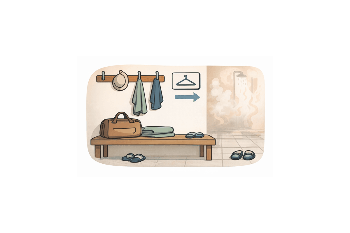 Одежду и сумки оставляем аккуратно, не разбрасывая по лавкам и крючкам, потому что это общее пространство, а не продолжение личной гардеробной. Шлёпанцы в раздевалке и душевых — не вопрос вкуса, а базовая гигиена и безопасность.