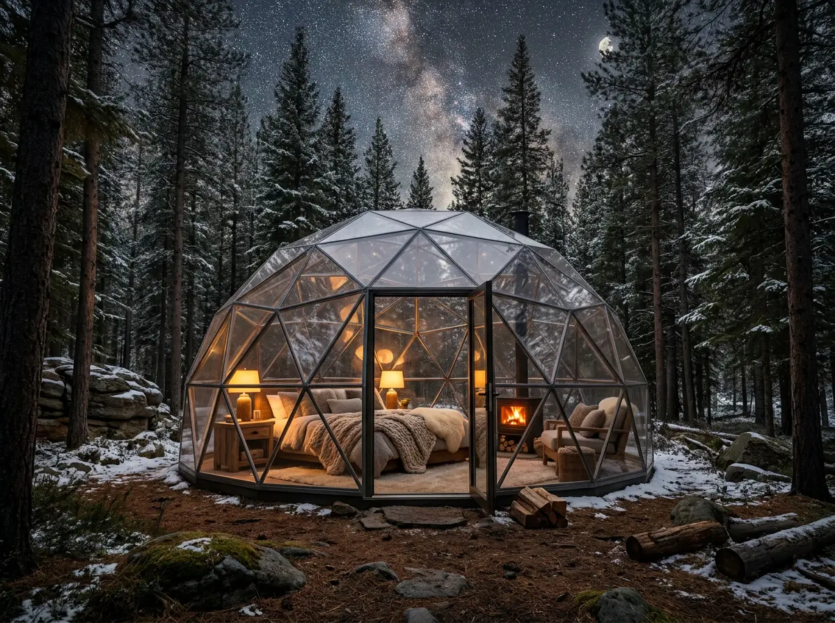 Один из самых узнаваемых форматов. Полусферические домики делают из прозрачного или полупрозрачного пластика, поэтому из кровати видно лес, горы или звёздное небо. Такой формат особенно любят в местах с красивым ночным небом — от северных регионов до пустынь.