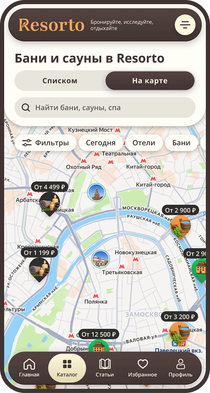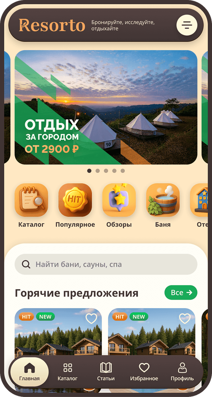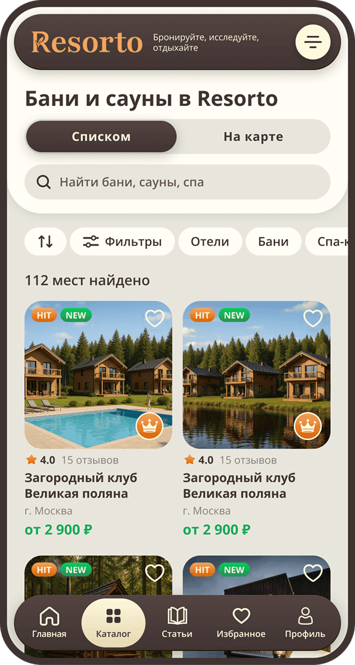 Resorto — это онлайн-сервис, который позволяет забронировать услуги бани, сауну, размещения в загородном отеле или посещения спа-центра. Мы собрали в одном каталоге проверенные варианты для тех, кто ценит свое время и хочет расслабиться без долгих поисков.