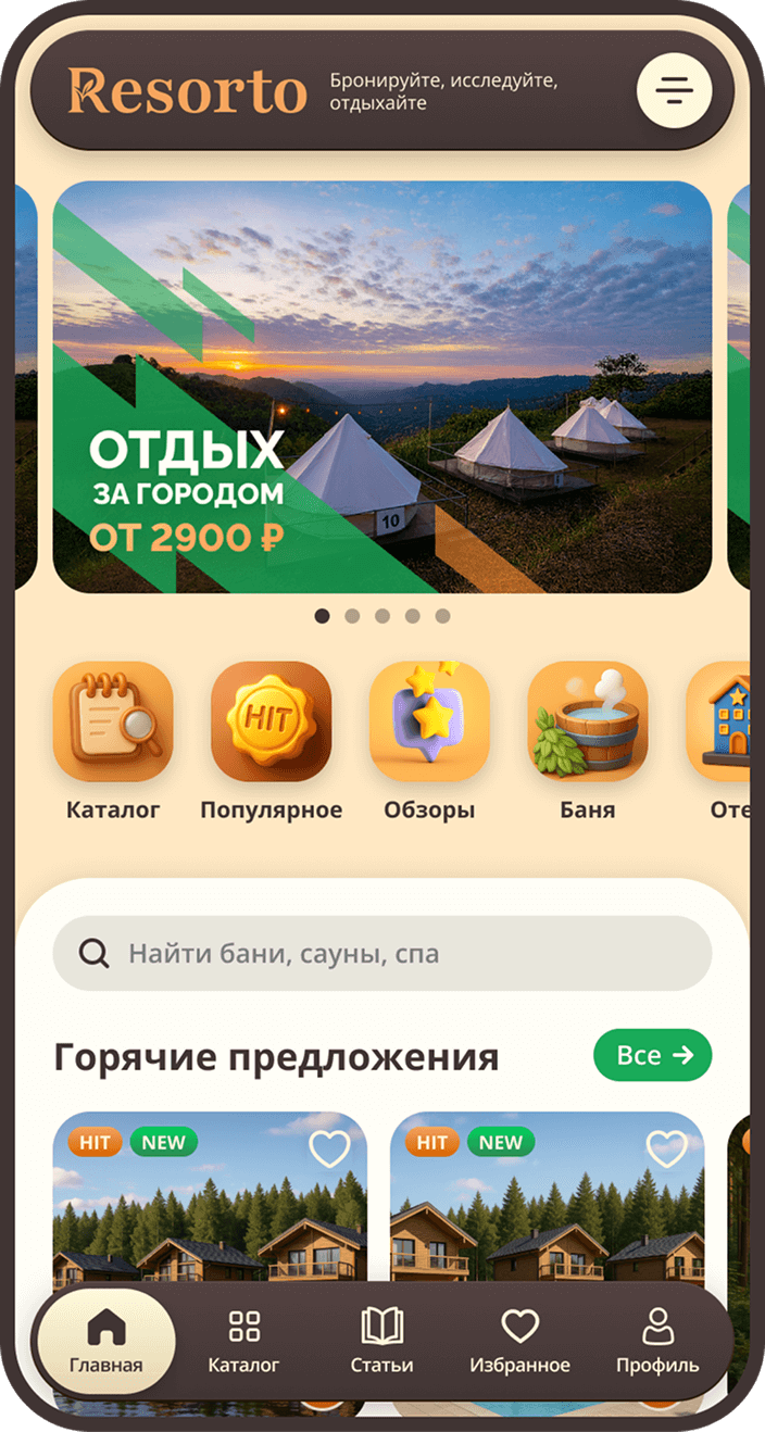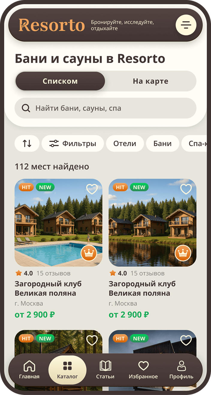 Resorto — это онлайн-сервис, который позволяет забронировать услуги бани, сауну, размещения в загородном отеле или посещения спа-центра. Мы собрали в одном каталоге проверенные варианты для тех, кто ценит свое время и хочет расслабиться без долгих поисков.